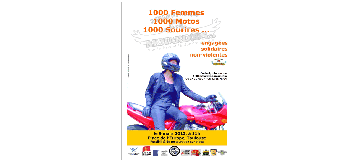 On this 9th of March, 2013 under the slogan “1000 women, 1000 motorbikes, 1000 smiles… committed in solidarity and nonviolence,” the second gathering of bikers will take place in Toulouse, riding in support of women around the world and particularly for those who don’t yet have the right to express themselves, have no access to education, and are often victims of brutality and subject to violence