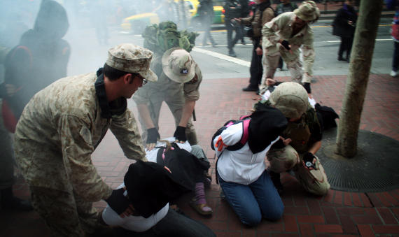 In the past decade, Iraq Vets Against the War (IVAW) has replicated these actions with a focus on Iraq and Afghanistan operations. IVAW vets conducted their own search-and-destroy theater, with “Operation First Casualty” teams in combat gear moving through Chicago during the presidential convention, as well as in New York, San Francisco and D.C. — detaining suspects all along the way, bringing tense desert situations to urban America. Operation First Casualty was so named, of course, because of the adage that “truth is the first casualty of war.”