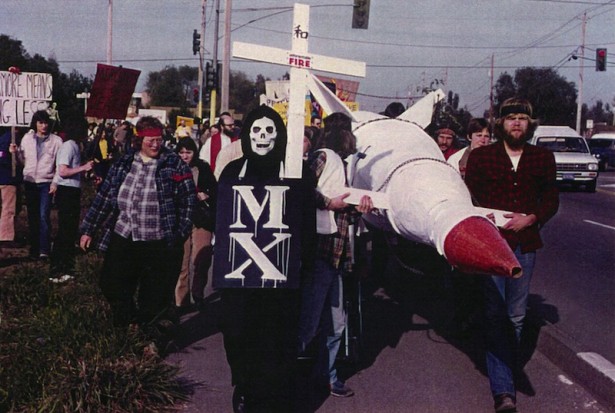 Thirty years ago this week, the nonviolent action community I was part of at the time — Spirit Affinity Group — organized “The Way of the Nuclear Cross” on Good Friday at Lawrence Livermore National Laboratory. LLNL has designed 50 percent of the U.S. nuclear arsenal and at the time was working on the MX missile. The event included a sunrise service across the street from the lab (during which three members of the group were confirmed into the Catholic Church) followed by a procession to the facility led by a group of us carrying the Nuclear Cross, a 400 pound mock-up of the MX missile. We eventually laid the “cross” in a nearby intersection and engaged in nonviolent civil disobedience. Eight people chained themselves to the missile, simulating a die-in. Two others laid in the roadway. Sixty-five others knelt in the crosswalks at the perimeter, blocking traffic. All of us were eventually arrested. A few of us spent Easter weekend in the local county jail.
