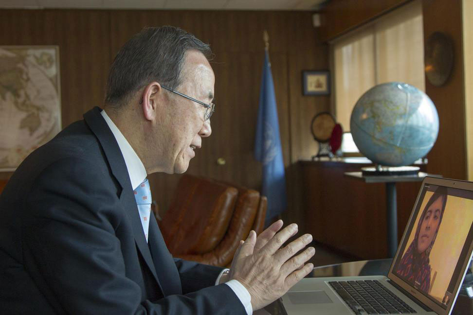 Secretary-General Ban Ki-moon chats with Malala Yousufzai via Skype in Madrid, Spain. UNTV