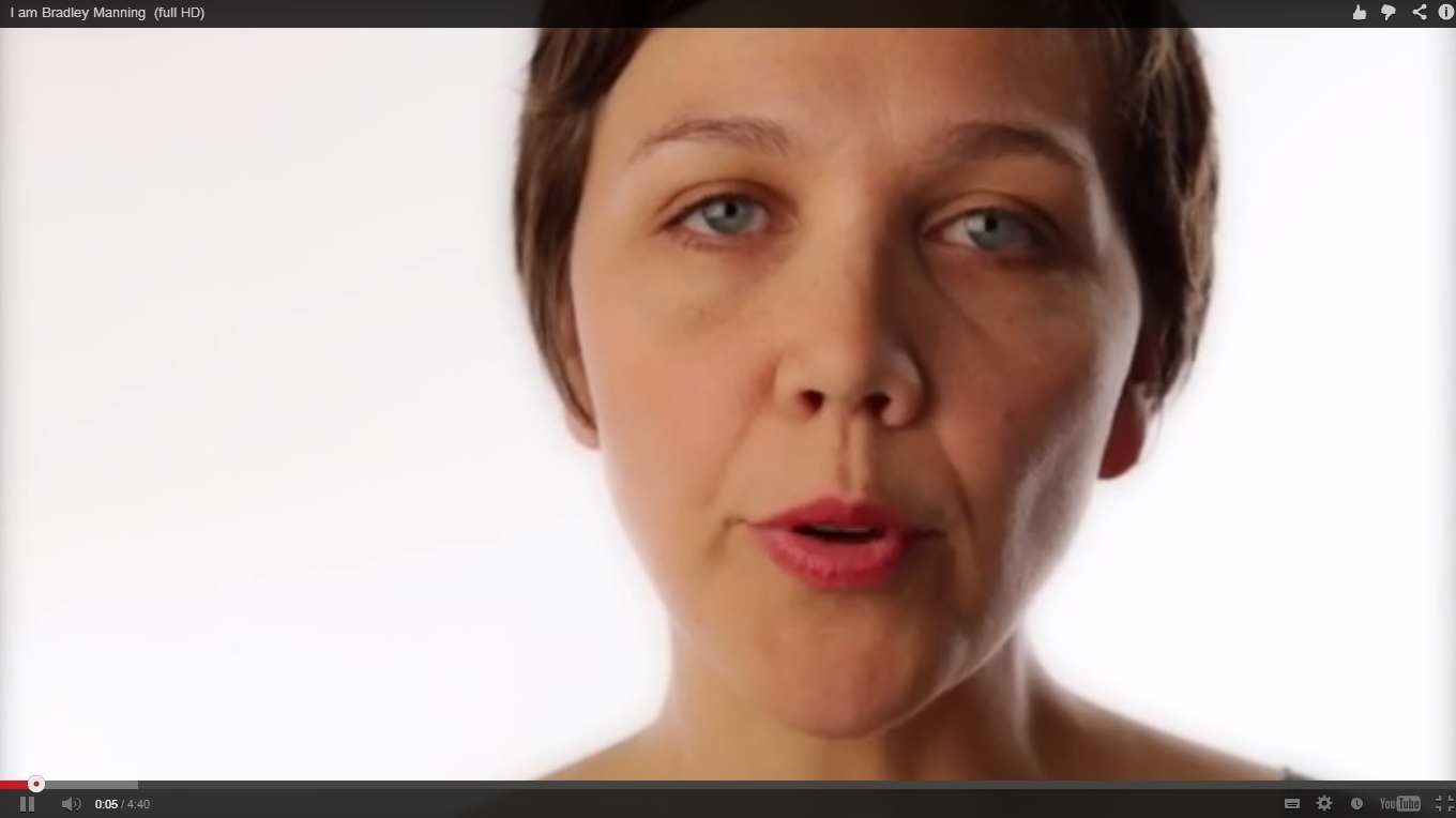 Filmmaker Oliver Stone; actors Russell Brand, Maggie Gyllenhaal, Wallace Shawn, Peter Sarsgaard; musicians Moby, Tom Morello, and Pink Floyd’s Roger Waters; writers Matt Taibbi, Alice Walker, Chris Hedges; and activists Lt. Dan Choi and Angela Davis, and others speak out in the short film, explaining that Manning sought to expose war crimes and inspire debate and reforms. They condemn the “aiding the enemy” charge with which the military wants to imprison him for life, arguing it criminalizes what should be recognized as whistleblowing.