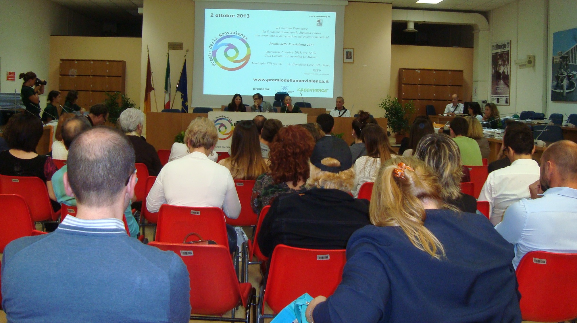 The Ceremony of Nonviolence Award 2013 has taken place in the boardroom of City Hall VIII (formerly XI) of Rome. Students of E. Fermi school of Macerata and of Ripetta art school in Rome were crowded in the room. Enthusiasm and excitement accompanied the event organized by International Organizations World Without Wars and Without Violence and Greenpeace.