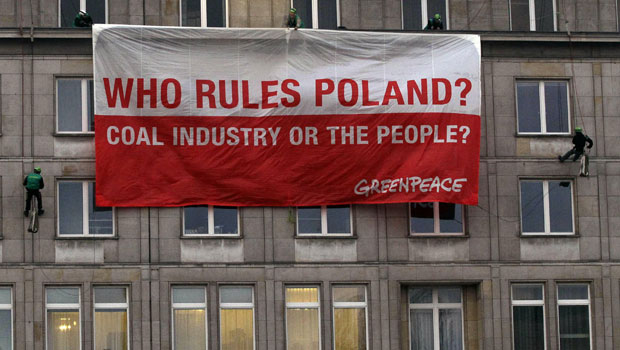 Poland, which gets 80 percent to 90 percent of its power from coal, hosted a parallel conference with the World Coal Association, called the International Coal and Climate Summit. UNFCCC chief Christiana Figueres enraged many climate activists by dignifying the coal conference with a keynote address. Outside the summit, Greenpeace activists in climbing gear hung from the Ministry of Economy with a huge banner, in the red and white of the Polish flag, stating “Who Rules Poland: Coal Industry or the People?” On the roof, others unfurled “Who Rules the World? Fossil Fuel Industry or the People?” On the plaza below, hundreds rallied against coal, arriving in a procession called “Cough 4 Coal” with two huge inflated lungs, signifying the destructive impact of coal on the atmosphere and human health.