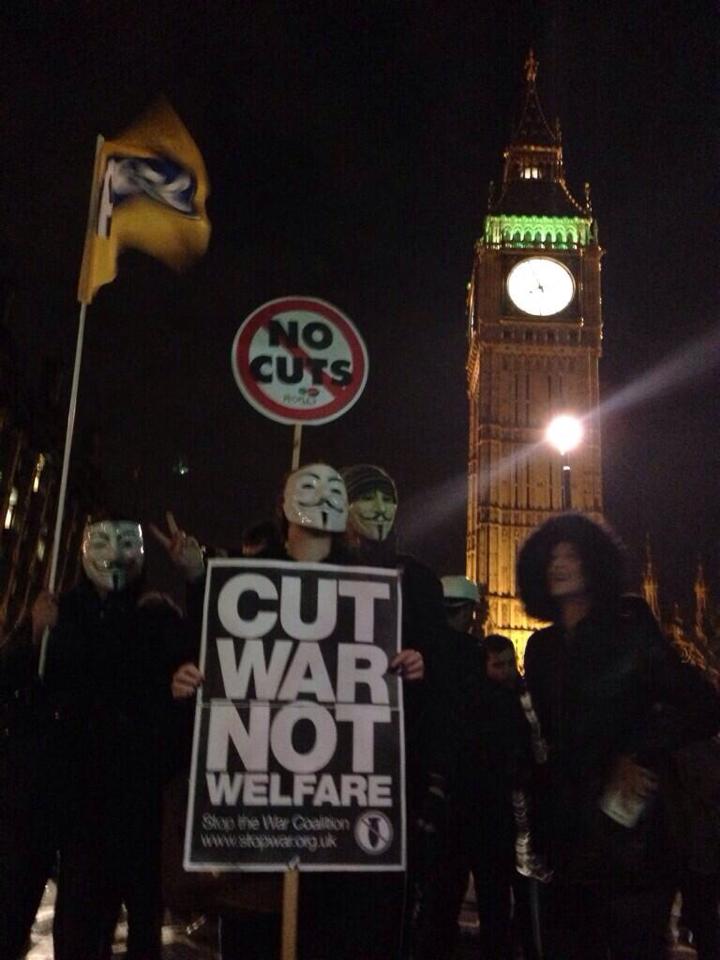 Anti-austerity events were organised by different groups in London in front of Buckingham Palace, Trafalgar Square and Parliament square and Westminster bridge, to coincide with similar actions in many countries around the world.
