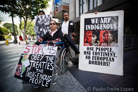 At a rally outside the Canadian consulate in Los Angeles, speakers denounced treaty violations on Native American reservations in the United States, the racism indigenous people experience and the dismal living conditions on reservations — such as the Pine Ridge reservation in South Dakota, which has the shortest life expectancy in the Western Hemisphere outside of Haiti. Students spoke about their lack of access to their own history, language and culture, and the effect it has on their sense of identity and empowerment. Elders spoke of the need to recognize the history of indigenous resistance in the United States such as the American Indian Movement, the occupations of Alcatraz and Wounded Knee, and the “Longest Walk” in 1978, which brought attention to 11 proposed pieces of legislation that would have violated native treaties and eventually resulted in the passage of the American Indian Religious Freedom Act. In their song “Idle No More,” Native American hip-hop artists Crystle Lightning and Red Cloud rapped about this being the time for all indigenous tribes and peoples, from both north and south of the Canadian border, to unify as one force in an “indigenous revolution.”