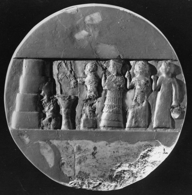 The three inscriptions on the disc identify the figures depicted: Enheduanna, an officer, her major domo and her scribe. The royal inscription on the disc, reads: “Enheduanna, zirru-priestess, wife of the god Nanna, daughter of Sargon, king of the world, in the temple of the goddess Innana.” The figure of Enheduanna is placed prominently on the disc emphasizing her importance in relation to the others and, further, her position of great power and influence on the culture of her time.