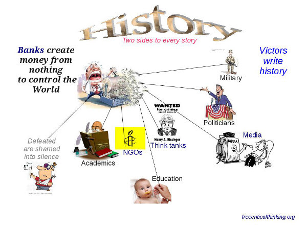 Military – the leaders of the winning armies decide what information is made public and tell their story of war – Winston Churchill wrote copious volumes on the history of the second world war. Historians rely on original military sources (invariably from the winning side) for information and so the winner’s military records determine the narrative. The security/intelligence/military industrial complex is funded and controlled by banking interests with taxpayers picking up the tab.