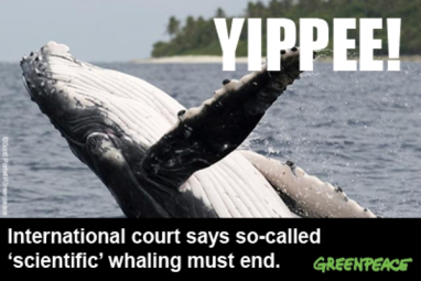 Japan’s sham ‘scientific whaling’ program me has just been declared ILLEGAL in an international court! At 10am, the judges of the International Court of Justice handed down its long-anticipated decision on whether Japan’s government-subsidised whaling program me in the Southern Ocean should be allowed to continue.