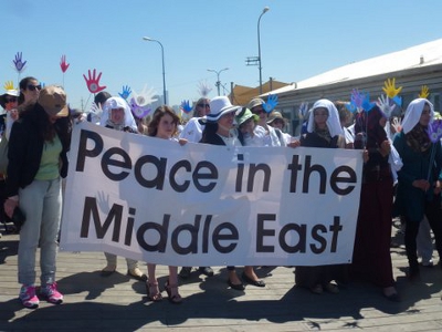 Then, with women and children at the head, and carrying a big sign saying Peace in the Middle East, everyone marched along the boardwalk of the Tel Aviv Port.