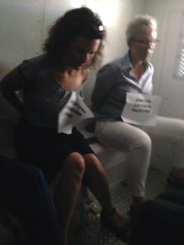 The photo shows the writer in the police van with Maia Ettinger, daughter and grand-daughter of Holocaust survivors.