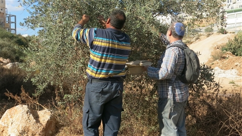**Photo: Annie Slemrod/IRIN | An Israeli and a Palestinian pick olives together in a disputed area.