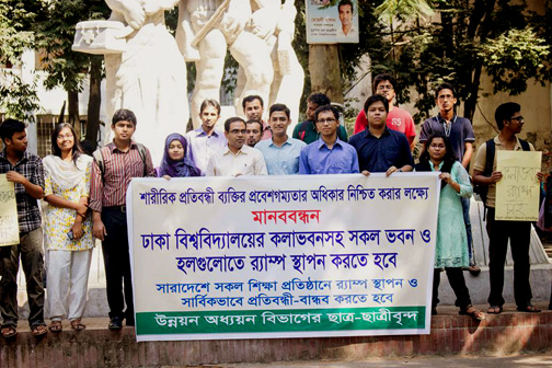 Students of the department of Development Studies, University of Dhaka organized a human chain and rally on Monday, November 10, 2014 at the premise of Aporajeyo Bangla to demand ramps in all academic institutions in Bangladesh along with the University of Dhaka.