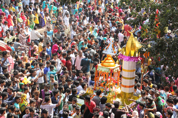 The participants wail in the procession chanting ‘Hay Husain, Hay Husain’. The replica of Duldul, the horse of Imam Husain (R) and the flags in the procession symbolize the presence of the Imam Hosain (R). This procession has been common here since 18th century. Horses and elephants were used in the procession. A fair is also arranged on the occasion of the day. Handicrafts, pottery, brass ware, bows and arrows, swords, merry-go-rounds, Latikhela (stick fight) etc are the attractions of the fair. Latikhela between two groups symbolize the battle between the two troops of Imam Husain (R) and his opponent Yazid.