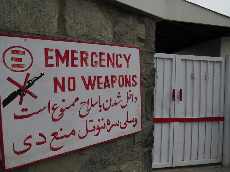 At the entrance to any one of Emergency’s clinics or hospitals, a sign at the door says “No Weapons Allowed.” A logo banning guns is next to the Emergency logo. Although they work in one of the most intense war zones in the world, Emergency staff, including security guards, reject any use of weapons inside their facilities.