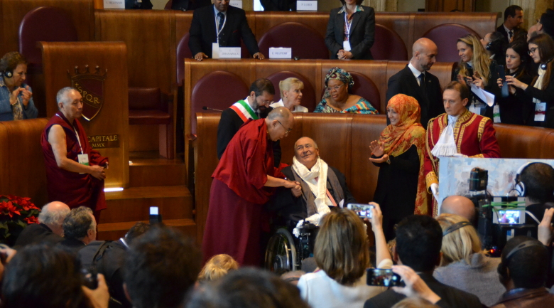 The strongest image of the allocating of the 2014 Peace Award to director Bernardo Bertolucci who arrived in a wheelchair was the gentleness with which the Dalai Lama gave him the microphone and protected him with a white scarf around his neck. Bertolucci remembered in a moving way his contacts with the Tibetan spiritual guide during the preparation of the film “Little Buddha” and stated that there is “a small Buddha inside each of us.”