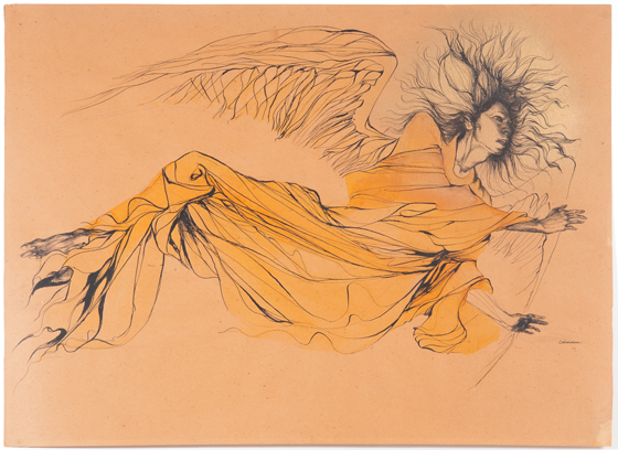 Cameron belonged to a generation which explored myth, and saw in it the empowerment of the individual beyond its day-to-day life. Originally from Iowa Marjorie Cameron (1922-95), known as Cameron, came to find her nurturing ground in California in the beginning of the mid 1940s. From a fashion illustrator, she developed into a painter, draftswoman and mystic. Encouraged by her husband’s interests, the two endeavored in various esoteric societies, and Cameron developed an iconography of angelic beings and mythical creatures that sprung from her dreams and visions. Her fine drawing line resembles a notion of her being a medium to an external force; its sensitivity reminds that of Egon Schiele. While Schiele’s portrayed women are very real individuals of his time, Cameron’s seem to be known only by her. Both artists chose to ignore any relation to a background which mystifies the depicted by elevating them beyond reality. Using attributes, such as a crown or a grail she enhances the figure’s mythical being. While abstract abstractionism started to prepare ground for the separation of the content of the artwork from the action of painting (J. Pollock), and fostered by the CIA’s intentions to distinguish U.S. from Communist society, began to idolize industrial products, artists like Cameron drifted into the background of the art world’s attention. Before and after her husband’s sudden death, she moved to Mexico. Upon returning to California in 1953, she found herself a part of the counterculture which worked a great deal in experimental film. First by artists, later by Hollywood’s public very much perceived as a mythical figure herself, Cameron starred in various avant-garde films, such as Kennet Anger’s 1954 Inauguration of the Pleasure Dome and Curtis Harrington’s 1961 Night Tide. Soon enough, society was ready to misunderstand and rejected her art which made her retreat to the Topanga Canyon, where she raised her child, continued making art, and was to become one of the movers of beatnik culture. She was inspired by Egyptian astrology as well as relations of the planets, and continued creating mythical figures out of her own life experience whose essence she tried to capture over and over again.