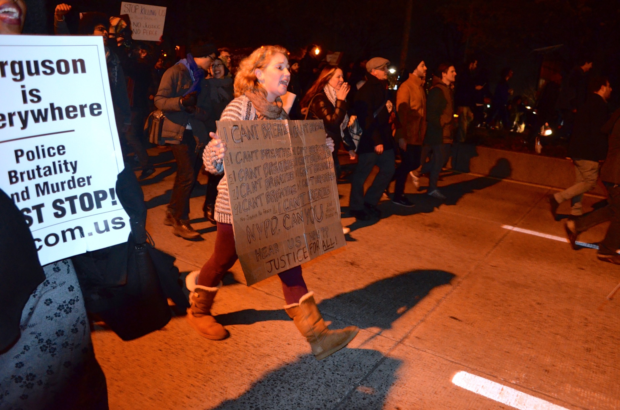 In New York, thousands of demonstrators shut down traffic around the city and part of the West Side Highway was effectively closed off as protesters streamed between vehicles, chanting “The whole damn system is guilty as hell.”