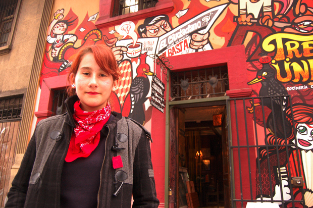 decía YO NO PRESTO EL VOTO. Ahí estaba la pelirroja dirigente estudiantil dando entrevistas y
