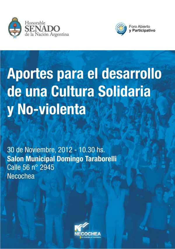 El próximo viernes 30 de noviembre tendrá lugar la jornada “Aportes para el Desarrollo de una Cultura Solidaria y No Violenta” en el salón municipal Domingo Taraborelli (Calle 56 N° 2946) de la Ciudad de Necochea, Provincia de Buenos Aires. El eje estará dado por la perspectiva de la No-Violencia, enfocada no solamente como una práctica que considera en no recurrir a la violencia, ya sea como método de protesta o como respuesta hacia otros, sino como una opción que pretende la humanización del mundo, promoviendo un cambio de la situación actual hacia una Cultura de la No-Violencia.