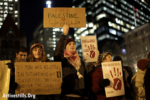 Cette opération « Pilier de défense » est payée grâce au chèque en blanc reçu par l’armée israélienne de la part du gouvernement des États-Unis. Et pendant que nous occupons les rues pour demander l’arrêt immédiat des bombardements dans la bande de Gaza, des roquettes sont lancées sur les communautés civiles en Israël. Nous sommes conscients qu’il faut en faire d’avantage pour mettre fin au blocus de la bande de Gaza.