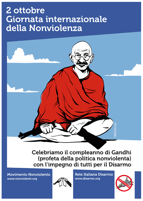In questa occasione il Movimento Nonviolento (fondato da Aldo Capitini, che ha introdotto in Italia il pensiero ed il metodo di Gandhi), ha promosso una iniziativa comune nazionale, in collaborazione con la Rete Italiana Disarmo. Tutti gli aderenti, i simpatizzanti, i singoli amici della nonviolenza, gruppi e centri e movimenti per la pace e la nonviolenza , sono invitati ad organizzare nella propria città o nel proprio paese un’iniziativa pubblica: una presenza in piazza, un banchetto, l’esposizione della nostra bandiera, una conferenza, una fiaccolata, la distribuzione di un volantino; un’azione che il 2 ottobre collegherà idealmente tutte le realtà impegnate nella campagna per il disarmo.