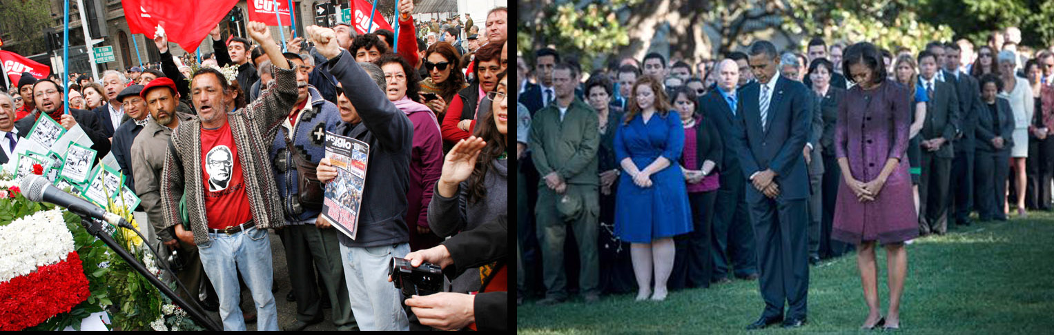 A 39 anni di distanza dall’11 settembre 1973 e 11 da quello del 2011 è oramai consolidato un dannoso antagonismo tra le due ricorrenze. Il ricordo dell’11 settembre 1973, l’abominio di un colpo di stato contro il governo democratico cileno presieduto da Salvador Allende, eterodiretto dagli Stati Uniti (nella foto il sicario Pinochet stringe la mano al mandante Kissinger), è osteggiato dal complesso mediatico-industriale fino a rappresentarne la volontà di commemorarlo come una provocazione, un’offesa alle vittime dell’11 settembre ‘ufficiale’.