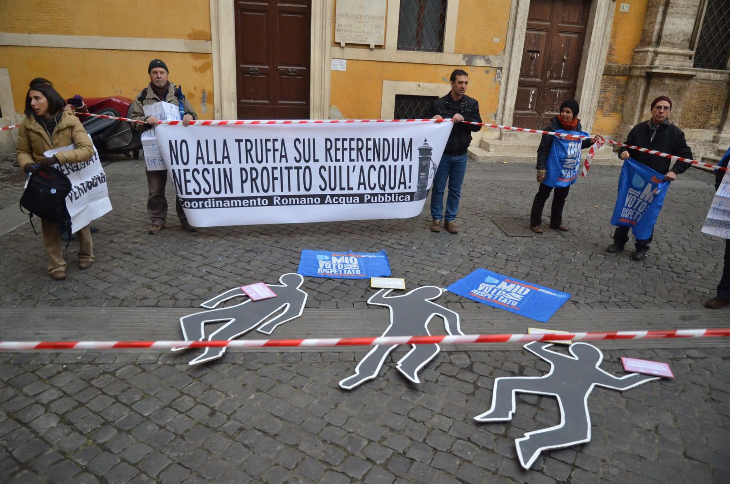Gli attivisti del Coordinamento Romano Acqua Pubblica hanno organizzato questa mattina la ricostruzione della scena del crimine dell’omicidio dei referendum davanti alla sede romana dell’Autorità per l’Energia Elettrica e il Gas. In questi giorni infatti l’Authority è in procinto di varare la nuova tariffa idrica che cancellerà di fatto i risultati dei referendum del giugno 2011 reinserendo sotto mentite spoglie il profitto garantito per i gestori abrogato dal voto della maggioranza degli italiani.